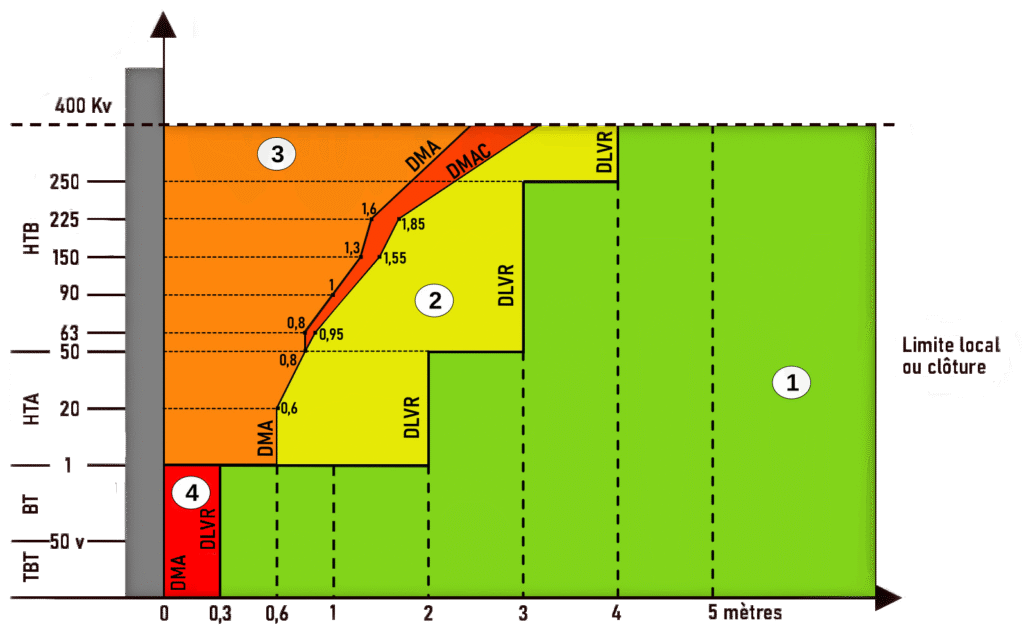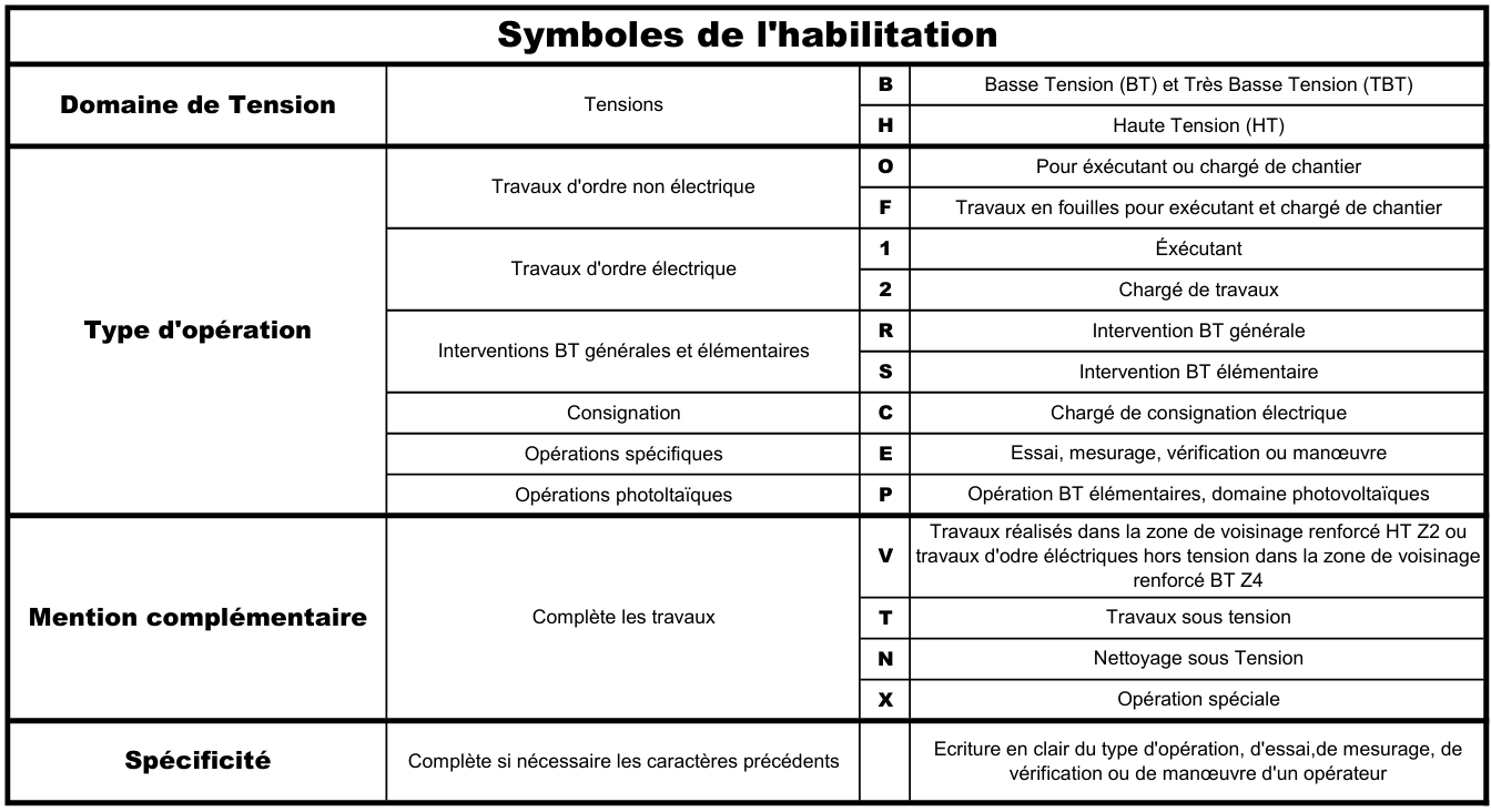 Exemple : B1V : Exécutant Basse Tension Autorisé à réaliser des travaux au voisinage de pièces nues sous tension (zone 4).